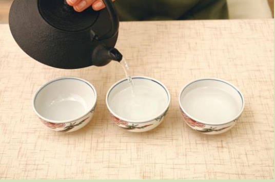 Häll kokande vatten i tekoppar för att sänka vattentemperaturen (120 ml per person).