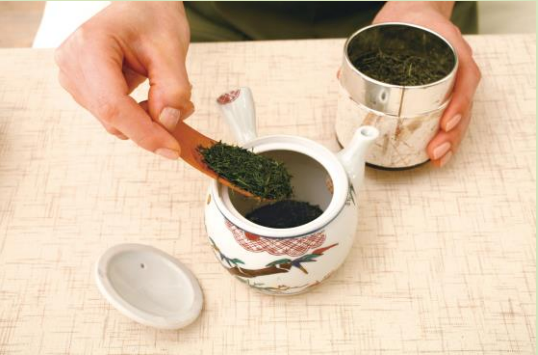 Lägg teblad i tekannan (ca 3 g per person, motsvarande 3/4 tesked).