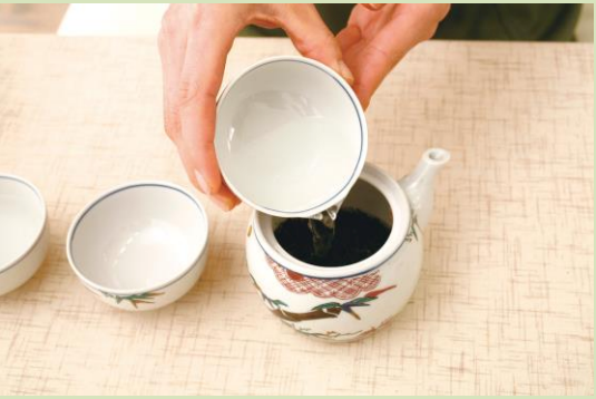 Häll det svalnade vattnet (70-80°C) från kopparna i tekannan och vänta 1-2 minuter innan servering.